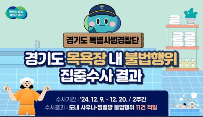 경기도 특별사법경찰단은 목욕장 내 불법행위를 수사해 신고 없이 매점에서 음식을 판매하거나 소비기한이 지난 제품을 보관하는 등 총 11건을 적발했다고 9일 밝혔다.