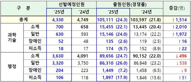 인사혁신처(처장 연원정)는 8일, 3~7일 진행된 9급 공채 원서 접수 결과 총 4,330명 선발에 10만 5,111명이 지원해 평균 24.3대 1의 경쟁률을 기록했다고 밝혔다. 이는 지난해(21.8대 1)보다 2.5대 1 상승한 수치다.