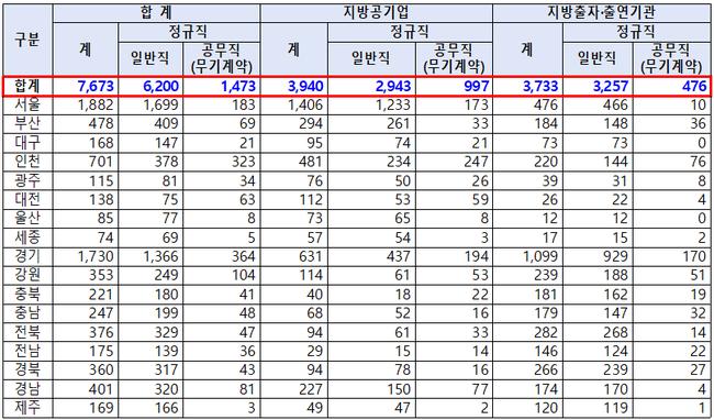 기관별로 보면, 지방공기업(164개 기관)은 3,940명을 채용해 지난해보다 5.9%(218명) 늘었으며, 지방출자·출연기관(843개 기관)은 3,733명을 채용해 전년과 비슷한 수준(0.2%, 7명 증가)을 유지했다.