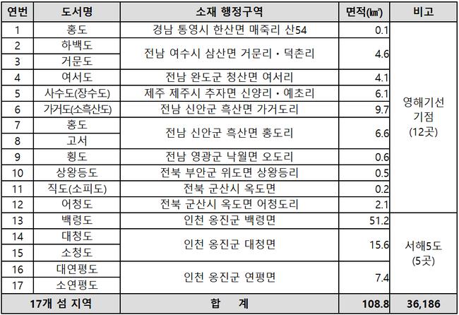 외국인 토지거래허가구역(이하 허가구역)으로 지정된 17곳 중 영해기선 기점 12곳은 최소 행정구역인 리 단위로 지정되었으며, 국토 방위상 중요성이 높은 서해5도는 섬 전체(3개 면)가 포함됐다.
