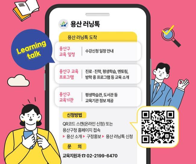 `용산 러닝톡`은 ▲초·중·고 교육 프로그램, ▲평생학습 프로그램, ▲평생학습관 및 도서관 등 교육기관 정보, ▲진로·진학 상담, ▲장학금 및 교육지원 사업 등 다양한 교육정보를 제공한다. 가입 신청을 하면 누구나 카카오톡을 통해 빠르고 편리하게 소식을 받을 수 있다.