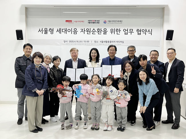 서울디자인재단, 서울시50플러스재단, 서울시여성가족재단은 지난 16일 서울 성동구 서울새활용플라자에서 ‘서울형 세대이음 자원순환도시 조성’ 업무협약을 체결하고, 장난감 순환 체계 구축을 중심으로 시니어 일자리 창출과 아동 돌봄 서비스 향상을 위한 협력에 나섰다.