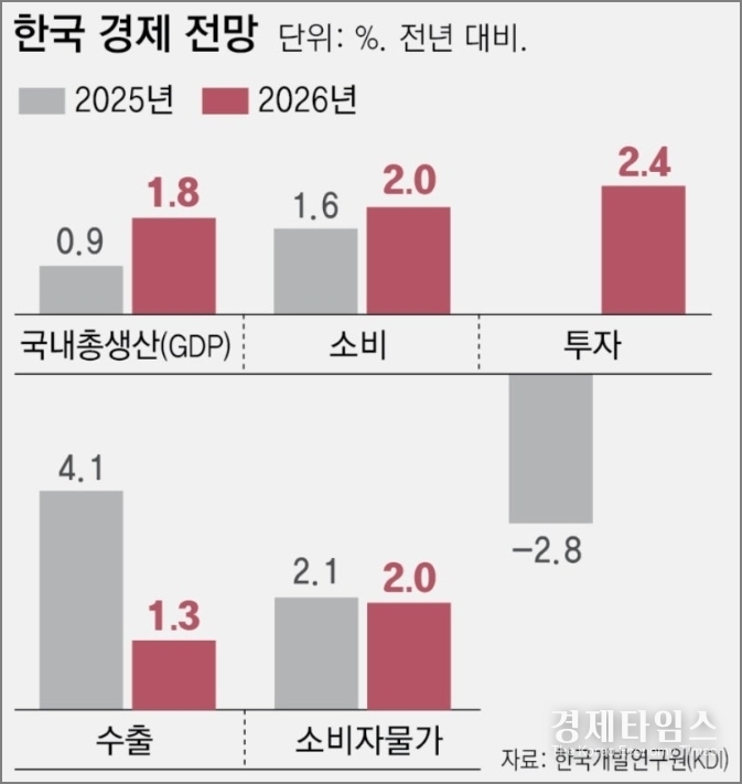 경제타임스 김은국 기자 | 한국개발연구원(KDI)이 2025년 한국 경제 성장률을 1.8%로 전망했다. 올해(0.9%)보다 높지만, 회복세는 완만하다. 내수는 소비·투자 회복세로 개선되지만, 미국의 고율 관세 정책이 본격화되면서 수출은 1.3% 증가에 그칠 것으로 내다봤다.