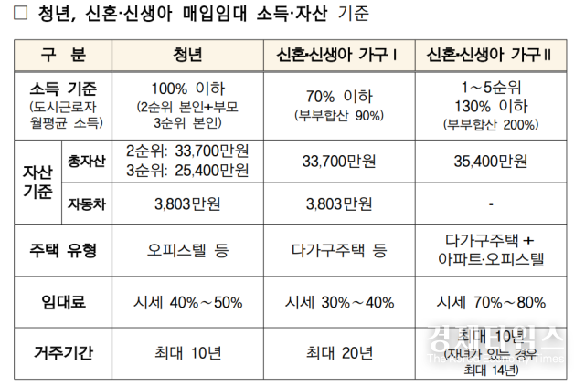 도시근로자 가구당 월평균 소득을 따져 유형을 나눈다. 신생아 가구는 1순위 입주자로 모집해 우선 공급한다. 결혼 7년 이내 신혼부부와 예비 신혼부부, 6세 이하 자녀를 양육하면 신혼·신생아 매입임대주택 입주자 모집에 신청할 수 있다.