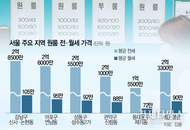 경제타임스 이준오 기자 | 서울 지역 원룸 임대시장에서 강남과 강북 등 지역간 전·월세 격차가 심화되고 있는 것으로 나타났다. 신사·논현 등 강남 지역 원룸 전세가는 서울 평균보다 20% 높은 반면 제기 등 강북 지역은 서울 평균보다 20% 이상 낮았다.