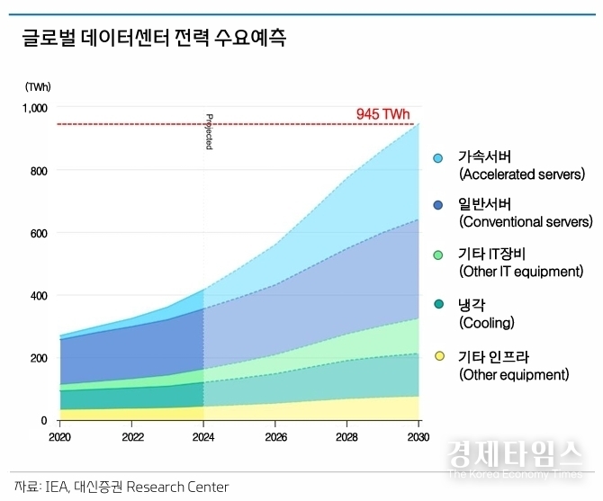 대신증권 보고서에 따르면 글로벌 데이터센터 전력 소비는 2024년 415TWh에서 2030년 945TWh로 약 2.3배 급증할 것으로 전망된다. 이는 일본의 연간 전력 소비량에 맞먹는 규모다. 특히 AI 전용 서버의 전력 소비는 2028년 600TWh에 달해 2024년 대비 3배 이상 폭증할 것으로 예상된다.