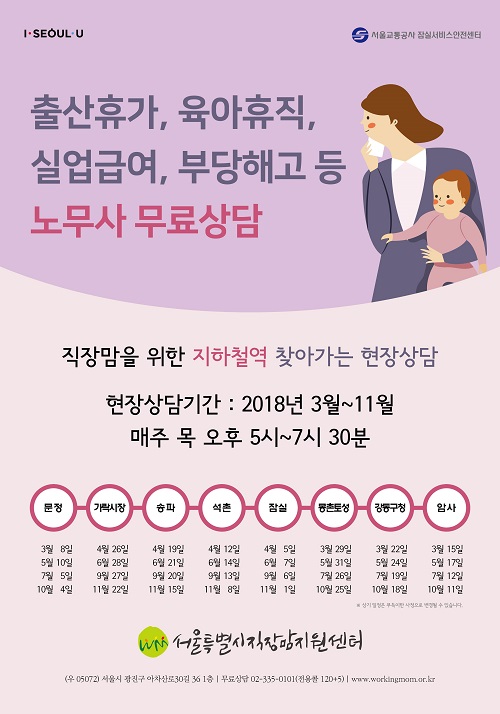 서울시 직장맘지원센터는 서울교통공사 잠실서비스안전센터와 업무협약을 맺고, 8호선 라인의 8개역(문정역, 암사역, 강동구청역, 잠실역, 석촌역, 송파역, 가락시장역)을 순환하며 상담을 진행한다.