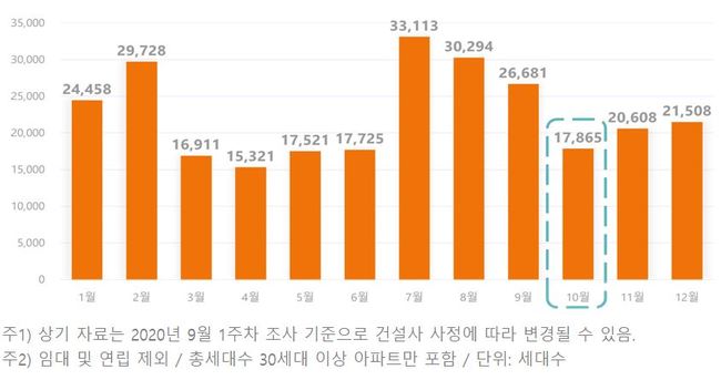 2020년 월별 아파트 입주물량 추이. (자료=(주)직방) 주택산업연구원조사에 따르면 전국 입주경기실사지수의 전망치가 2개월 연속 60선(7월 76, 8월 67.5, 9월 69.6)을 보이며 9월 입주 여건 악화가 이어질 것으로 보인다.