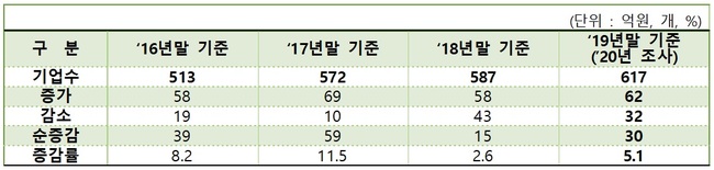 2019년 말 기준 벤처천억기업은 전년 동기 587개사 대비 30개 증가한 617개로 나타났다. 매출 1000억원을 최초로 달성해 신규 진입한 기업은 62개사로 벤처천억기업에서 제외된 기업은 32개사다.