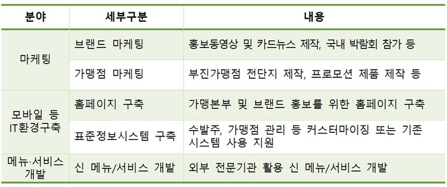 상생협력 프랜차이즈 지원 사업은 성장 잠재력이 큰 유망 소상공인과 중소 가맹본부를 발굴해 브랜드‧디자인 등의 초기 사업화와 마케팅‧스마트화 등의 성장지원을 통해 기업화를 촉진하는 사업이다.