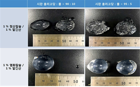 완성된 올리고당에 알긴산나트륨과 칼슘이온 처리를 해 구체화 현상을 유도하면 투명하고 매끈한 알긴산-칼슘 피막이 생겨 구슬형 올리고당이 만들어진다.