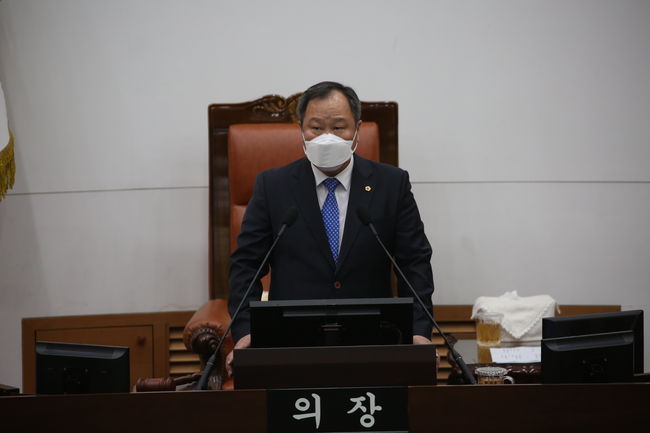 오세훈 서울시장이 19일 오후 서울 중구 서울시의회에서 열린 시의회 `제300회 임시회 개회식`에 참석해 축사를 하고 있다. 조희연 서울시교육감이 19일 오후 중구 서울시의회에서 열린 시의회 `제300회 임시회 개회식`에 참석해 축사를 하고 있다.