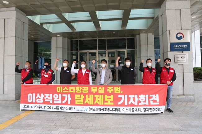공공운수노조 이스타항공조종사지부(이하 노조) 등은 28일 오전 서울 종로구 서울지방국세청 앞에서 기자회견을 열고, 이스타항공 부실 주범인 이상직 일가의 탈세를 제보했다.