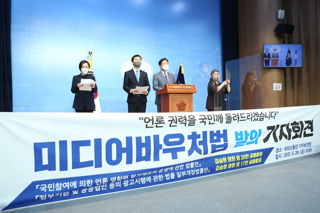 이날 기자회견에는 미디어바우처법을 대표발의한 김승원 의원과 함께 장경태, 유정주 의원이 함께 자리했으며, 박영순, 민형배, 이규민, 최강욱, 황운하 의원도 뜻을 함께 했다.