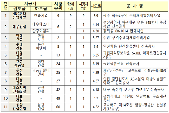 이어 대우건설이 2명, 현대건설, 롯데건설, 태영건설, 효성중공업, 두산건설, 대방건설, 에스지씨이테크건설, 대보건설, 동양건설산업 등 9개 건설사에서 각 1명의 사망자가 발생한 바 있다.