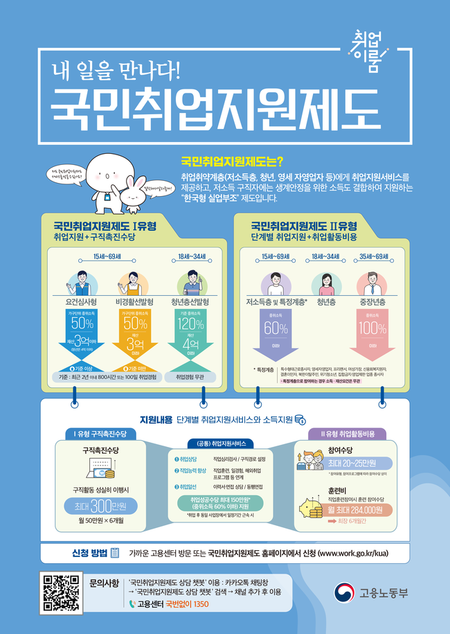 국민취업지원제는 15~69세 기준 저소득 구직자와 청년, 경력단절여성 등 취업취약계층을 대상으로 취업지원서비스와 최장 6개월간 월 50만원의 구직촉진수당을 제공한다.