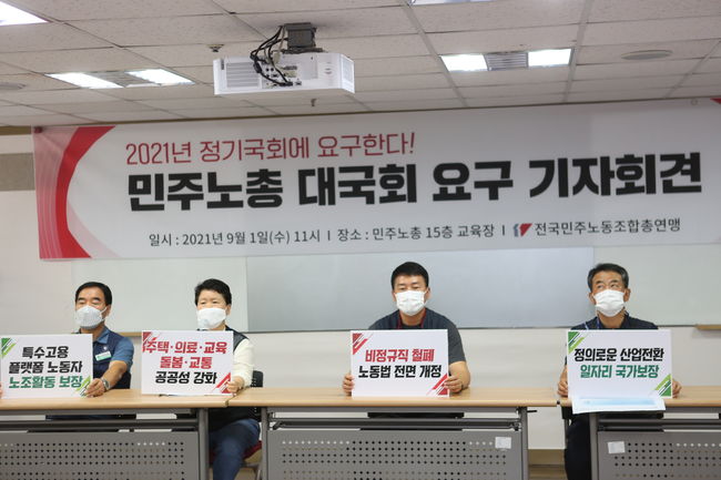 전국민주노동조합총연맹(이하 민주노총)은 1일 서울 중구 민주노총에서 `민주노총 요구안 발표 기자회견`을 열고 "2021년 정기국회는 한국사회대전환의 계기가 돼야 한다"고 주장했다.