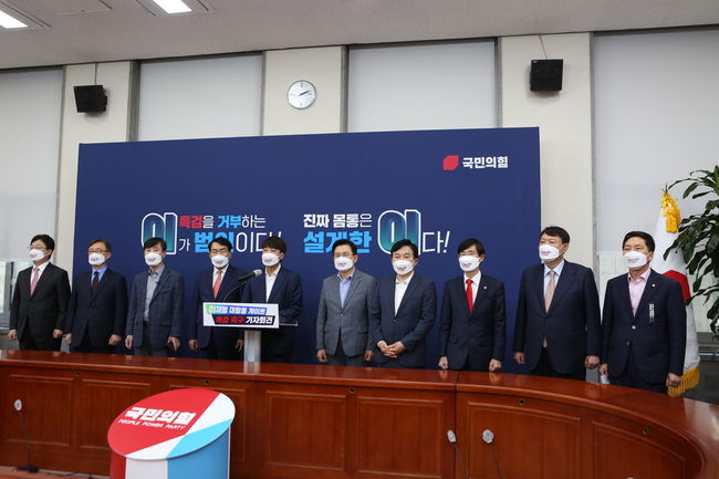 이날 기자회견에는 당내 대권 주자인 윤석열 전 검찰총장, 유승민 전 의원, 최재형 전 감사원장 등이 참석했다.