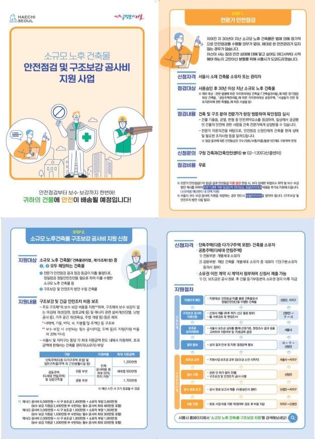 시는 2018년부터 시작된 소규모 노후건축물 안전점검 지원 사업을 통해 2021년까지 서울시에 있는 30년 넘은 노후건축물 약 26만동 중에서 2만 8000동을 점검 지원했으나, 아직도 안전점검이 필요한 노후건축물이 많다고 지적했다.