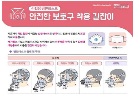 산업용 방진마스크는 사용 전 작업환경에 적합한 방진마스크를 선택하고, 사용자의 얼굴에 알맞도록 조절하여 사용하여야 한다.
