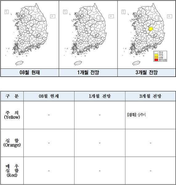 논 작물은 저수율이 낮은 전남 나주시가 11월까지 ‘주의’단계로 관리가 필요하고, 밭 작물은 최근 폭염으로 토양수분이 낮은 9개 시·군을 8월까지 ‘주의’단계로 관리할 예정이다. 다만, 토양유효수분율의 특성상 20㎜이상 강우 시 해소 될 전망이다.