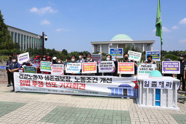 전국건설산업노동조합은 28일 서울 여의도 국회 앞에서 `건설노동자 생존권 보장과 노동조건 개선 입법 투쟁 선포` 기자회견을 진행했다.