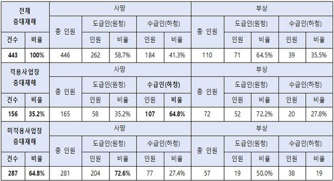 이 중 중대재해처벌법이 적용되는 사업장에서 일어난 사고는 156건(35.2%)를 차지했고, 중대재해처벌법이 2년 후 시행될 예정인 미적용 사업장의 경우는 287건(64.8%)를 차지해, 중대재해가 적용 사업장 보다 미적용 소규모 사업장에 1.8배 더 발생한 것으로 확인되었다.