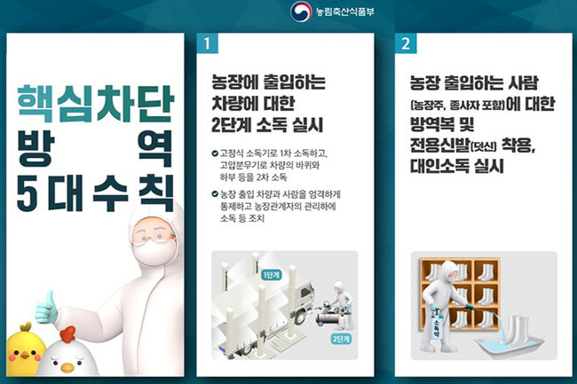 김인중 농림축산식품부 차관은 “농가에서는 야생동물(쥐, 고양이 등)의 축사 출입 때문에 발생할 수 있으므로 환기창에 차단망 설치, 주기적인 구서 작업 등 관리를 강화하면서, 농장 내 소독을 매일 실시하는 등 5대 차단 방역수칙을 철저히 준수해달라"고 요청했다.