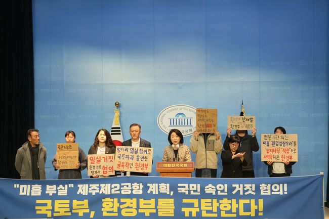 심 의원과 반대 단체는 “현재 국토부가 제시한 대책 수준으로는 ‘제주 성산읍에 공항을 건설하는 것은 환경과 안전 측면에서 적절하지 않다’는 것이 전문 검토기관의 의견”이라며 “그러나 환경부는 정반대로 ‘입지타당성이 인정된다’고 밝혔다”고 말했다.