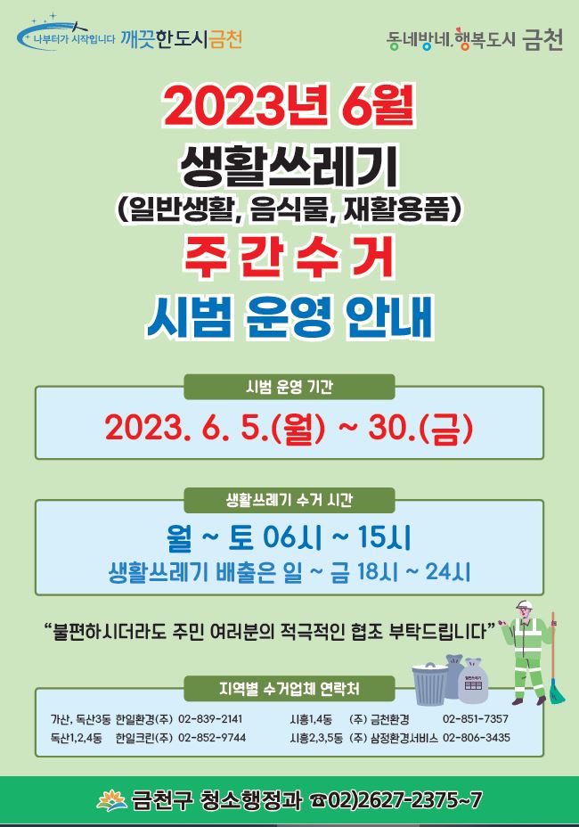 금천구는 6월 5일부터 30일까지 4주간 주간(晝間)에 생활폐기물(일반생활, 음식물류, 재활용품)을 수거한다고 밝혔다.