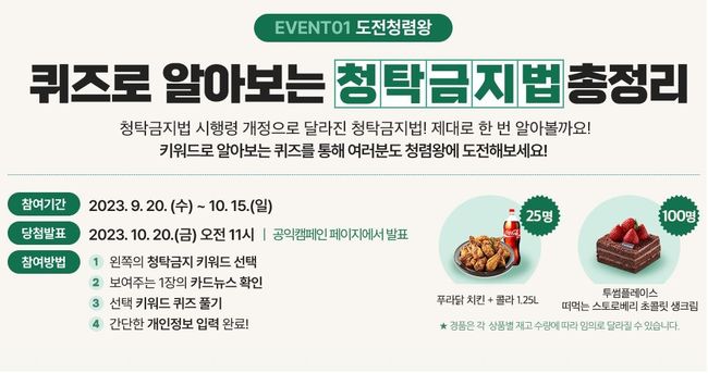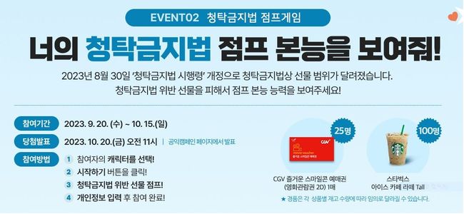 캠페인은 ▴이벤트1 도전청렴왕 “퀴즈로 알아보는 청탁금지법 총정리” ▴이벤트2 청탁금지법 점프게임 “너의 청탁금지법 점프 본능을 보여줘”로 구성된다.