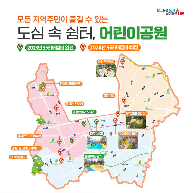이에 구는 2025년까지 노후도가 높은 어린이공원 23개소 대상 ‘테마형 놀이터 조성 사업’을 추진, 지난해까지 총 9곳의 정비를 마쳤다. 올해는 이달 중 나머지 3곳을 마무리해 개방하고, 연말까지 신월동 4개소, 신정동 3개소, 목동 2개소, 총 9개소의 노후 어린이공원을 각양각색의 주제를 품은 놀이터로 탈바꿈할 계획이다.