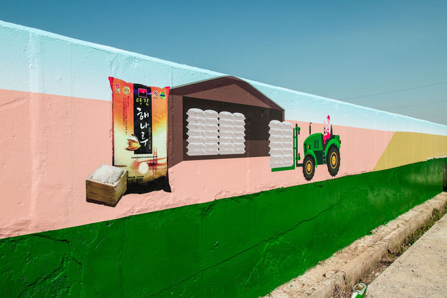 센터에서는 주민과 함께 우강면의 자랑인 넓은 평야와 쌀을 주제로 농경사회의 변천사를 상징화하여 도안을 완성했다. 180m의 넓은 담벼락에 소를 이용한 쟁기질, 모내기, 경운기, 트랙터, 드론 등 농경의 발전을 한 눈에 알아볼 수 있도록 시공하고 당진시의 대표 브랜드 ‘해나루쌀’도 한 면을 장식했다.
