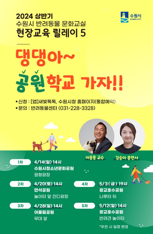 수원시 반려동물센터가 2024년 상반기 반려동물 문화교실 ‘현장교육 릴레이5’를 연다고 밝혔다. 사업명은 ‘댕댕아~, 공원학교 가자~!!’이다.