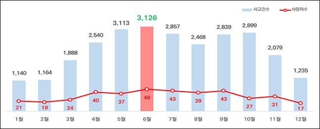 자전거 교통사고는 연중 6월에 가장 많이 발생했고, 금요일 오후 시간대가 사고에 취약한 것으로 나타났다.