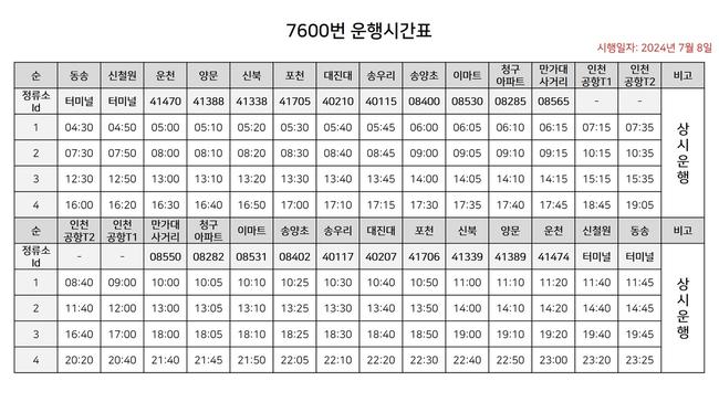 7600번 노선은 동송터미널에서 출발해 양문1리터미널, 신북면행정복지센터, 포천공영버스, 대진대학교, 송우리터미널을 거쳐 인천공항을 하루 4차례 왕복 운행한다.