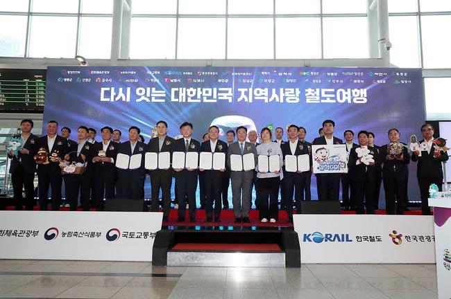 국토교통부, 행정안전부, 문화체육관광부, 농림축산식품부와 한국철도공사, 한국관광공사, 한국농어촌공사, 23개 지자체 시장·군수는 16일 오후 서울역에서 ‘인구감소지역 철도 및 관광 활성화를 위한 업무협약’을 체결했다.