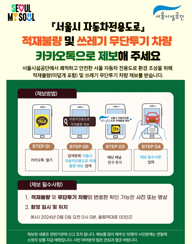 자동차전용도로 운행 중 쓰레기 무단투기를 목격했거나 적재 불량 차량을 발견한 경우 즉시 신고할 수 있는 채널도 운영한다. 카카오톡 ‘친구’ 화면 검색창에 ‘서울시 자동차전용도로 적재불량 제보’ 채널을 추가하고 위반차량 사진이나 동영상을 전송하면 된다.