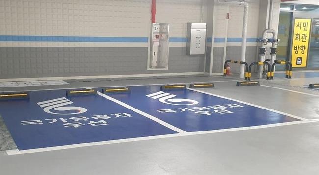 국가유공자 우선 주차구역은 주차 편의와 안전을 고려해 주차장에서 시민회관 방면 엘리베이터 바로 앞에 2면을 확보해 설치하고 `국가유공자 우선` 문구를 표시했다.