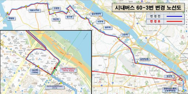 김포시(시장 김병수)는 오는 8월 16일부터 시내버스 60-3번 노선의 종점단축(경방타임스퀴어→당산역), 88번 노선의 종점단축(영등포시장→송정역) 및 김포공항역3번출구 경유 노선변경을 시행한다고 밝혔다.