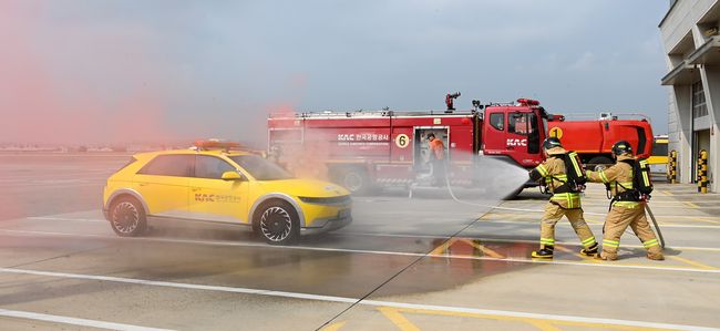 23일, 김포공항 항공기 이동지역에서 실시한 전기차 화재소방훈련에서 공항소방대가 화재차량에 초기 방수하고 있는 모습 공사는 최근 인천 송도 아파트 지하주차장 화재, 포르투갈 리스본의 국제공항 인근 렌트카 주차장 화재 등 전기차 화재 사고가 잇따른 상황에서 화재 발생 시 신속하고 정확한 초동 대응을 통해 피해를 최소화하고자 전기차 화재발생에 대비한 실전적인 소방훈련을 선보였다.
