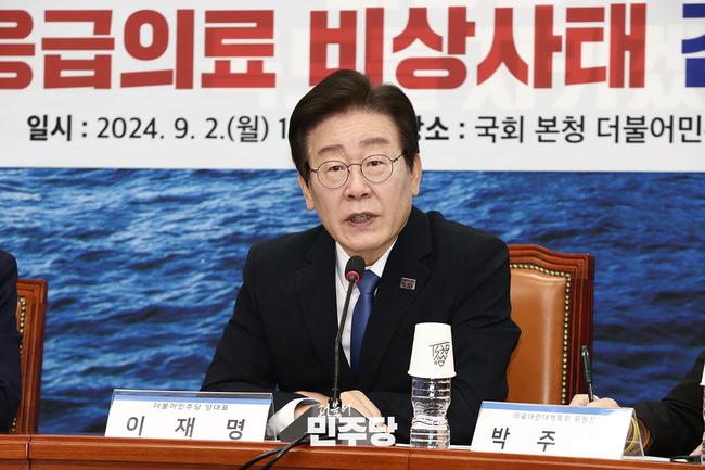 이재명 더불어민주당 대표는 2일 오전 국회 본청 당대표 회의실에서 열린 `의료대란대책특위-대한응급학회 응급의료 비상사태 간담회`에서 모두발언을 통해 응급의료 체계의 심각한 위기 상황을 지적하며 정부의 무리한 정책 강행을 비판했다.