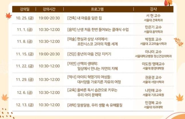강의 주제는 ▲내 마음을 담은 집 ▲난생 처음 들어보는 클래식 수업 ▲프란시스코 고야의 작품 세계 ▲중년의 마음 건강 지키기 ▲산책의 생태학 ▲아이티 혁명기의 여성들 ▲올바른 독서 습관으로 키우는 우리 아이 문해력 ▲알쏭달쏭, 생활 속 유해물질 등 8개 강의로 구성됐다.