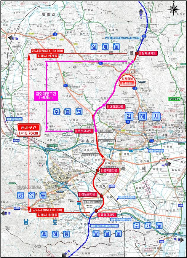 국도 58호선 무계~삼계간 대체우회도로 공사는 김해시 장유동 응달에서 삼계동까지 총 13.76km를 연결하는 총사업비 4,772억원 규모로 지난 2008년 3월 착공해 이번에 주촌~삼계 구간을 부분 개통하고 2025년 12월 전체사업을 완료할 계획이다.