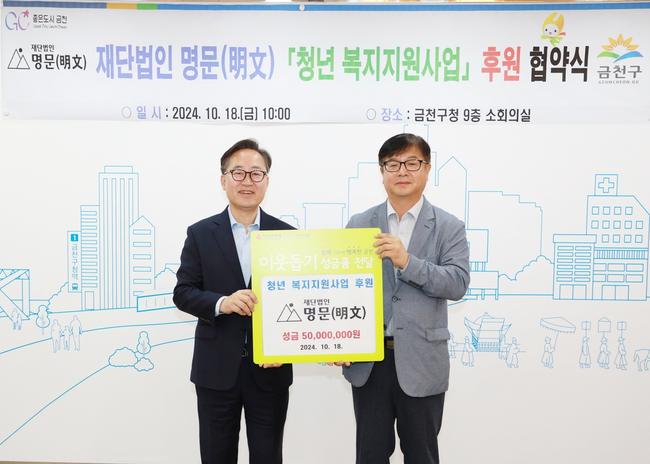 유성훈 금천구청장은 "어려움을 겪고 있는 소외된 청년들을 위한 사회적·경제적 생계 지원과 미래가 촉망받는 대학생 장학금 지원까지, 금천구의 청년층을 위한 다양한 복지지원사업을 추진할 수 있게 후원해주신 명문에 감사드린다"고 말했다.