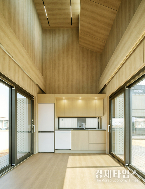 LG전자는 이를 위해 주택 설계를 새롭게 했다. 기존 채광을 위해 층고를 높인 형태의 지붕을 평평하게 변경하는 한편, 주택을 구성하는 기본 모듈을 통일해 마치 블록처럼 이어 붙일 수 있도록 했다. 8평형 모델은 모듈 3개를 조립하고, 16평형 모델은 모듈 6개를 조립하는 식이다. 건축비 절감은 물론, 2층형 등 고객 니즈에 맞춘 다양한 형태로의 확장에도 유리하다.