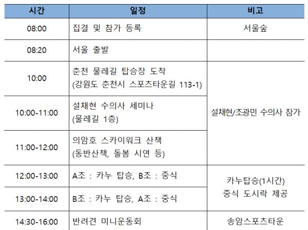 반려견과 함께하는 춘천 물레길 여행 일정표. (사진 = 한국관광공사 제공) 첫 번째 일정은 EBS ‘세상에 나쁜 개는 없다’에 출연 중인 반려동물 전문가 설채현 수의사의 ‘강아지가 행복해지기 위한 7가지 방법’에 대한 특강을 들으며 반려견에 대한 이해의 폭을 넓히는 시간을 갖는다.