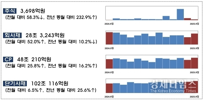금융감독원 관계자는 “9월에는 대규모 차환 수요와 함께 양호한 신용등급 기업 중심의 회사채 발행이 확대됐다”며 “단기사채와 CP시장도 금리 안정세에 힘입어 발행이 늘었다”고 설명했다.