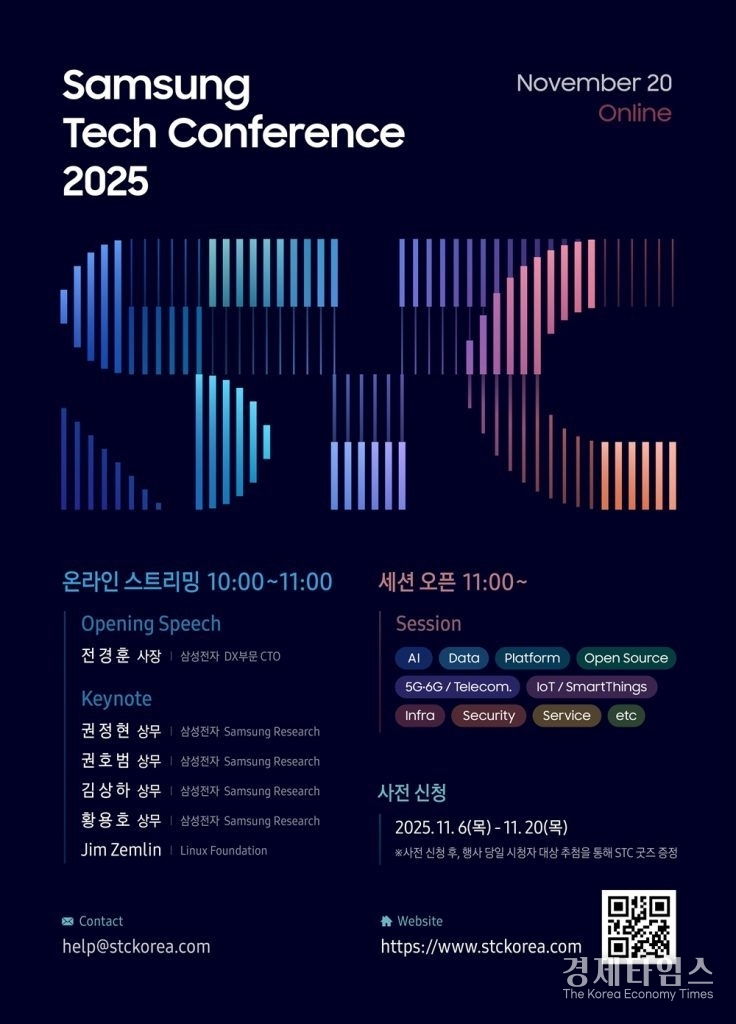 삼성전자는 오는 20일 '삼성 테크 콘퍼런스 2025(STC 2025)'를 온라인으로 개최한다고 11월 6일 밝혔다.