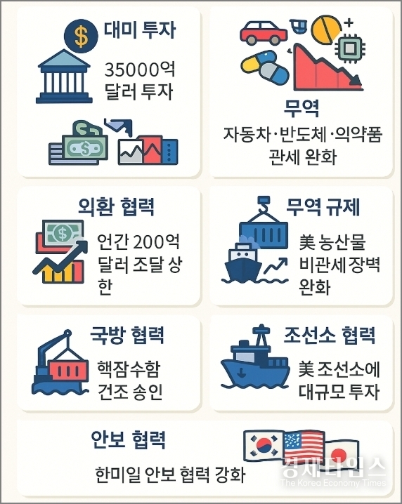 안보 협력 강화 조항은 이번 합의의 또 다른 핵심이다. 한국은 국방비를 GDP 대비 3.5% 수준으로 조기 상향하고, 미군 장비 250억달러 구매 및 주한미군 지원 330억달러 계획 등을 제시했다. 미국은 확장억제 공약을 재확인하고 핵협의그룹(NCG) 정례화에 합의했다. 이는 최근 동북아 안보정세 변화 속에서 한·미 동맹의 구조적 결합이 강화되고 있음을 의미한다.